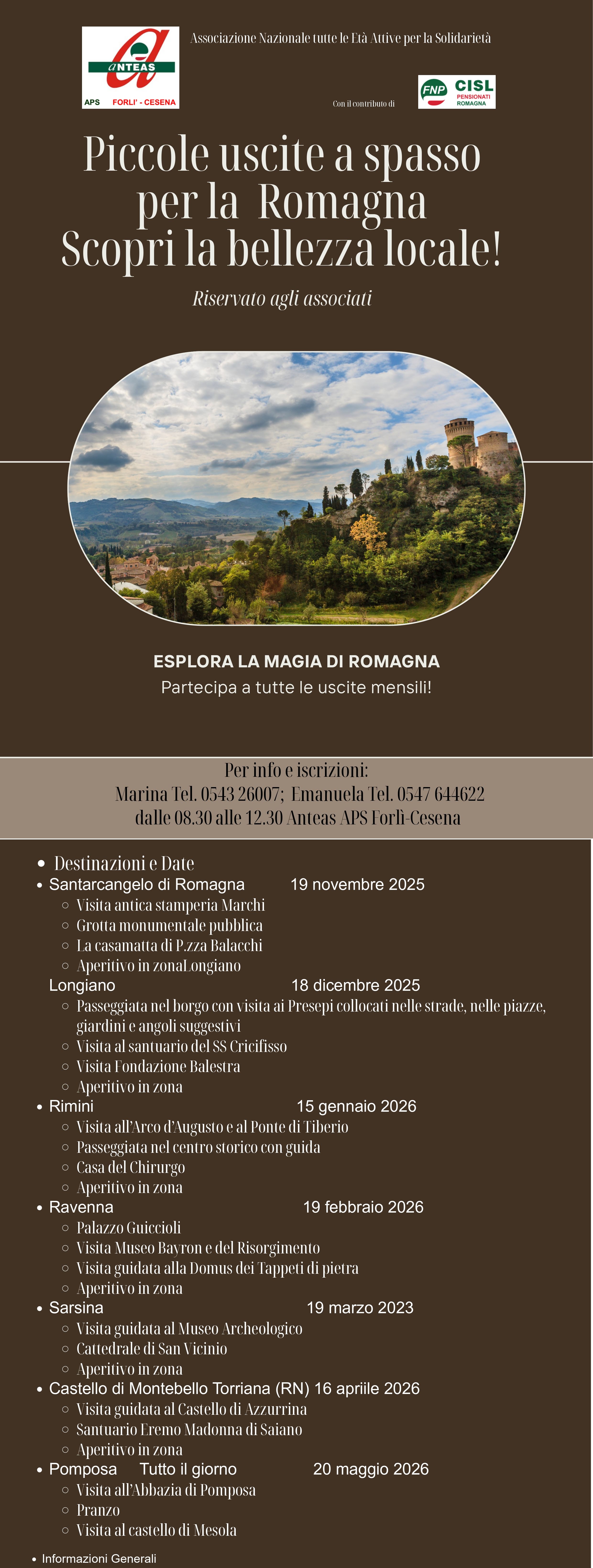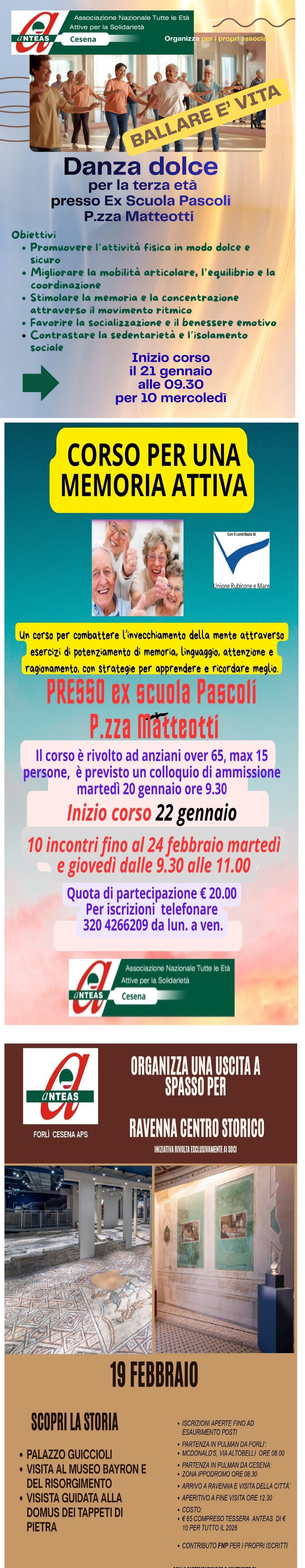 Nel 2006 apre la sede centrale a Cesena con presidi dislocati nei comuni limitrofi, in collaborazione con le istituzioni del territorio quali comuni e AUSL, cura e promuove progetti dedicati alle fasce pił deboli della popolazione, in particolare le persone over 65. I progetti e i servizi Anteas sono attivi nelle zone dellOltresavio, San Carlo, Gualdo, Piavola, Linaro, a Cesenatico, San Mauro Pascoli, San Mauro Mare e San Piero in Bagno. Si tratta principalmente di centri di accoglienza sociali, del Progetto solitudine, del servizio di trasporto e consegna pasti a domicilio, sostegno al carrello spesa, pagamento bollette, sostegno alle famiglie pił fragili e allo studio. Tutti servizi realizzati dai volontari Anteas di Cesena e svolti in forma totalmente gratuita.